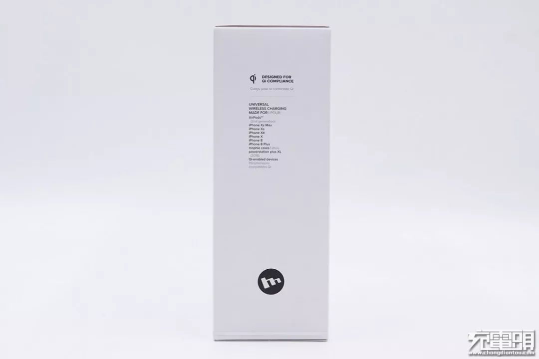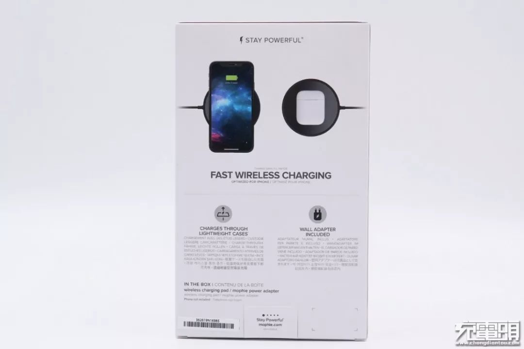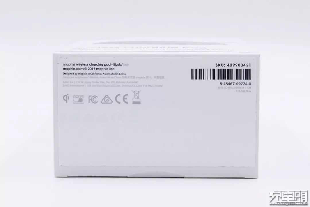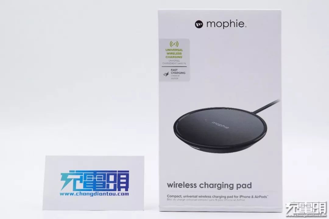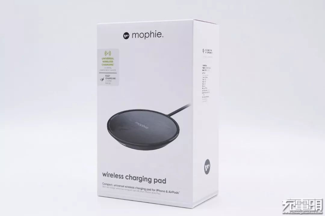 頂部為品牌Logo,正面中心位置印有產(chǎn)品實(shí)物圖,底部為產(chǎn)品名稱mophie wireless charging pad。