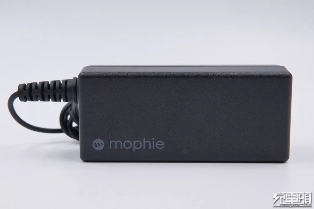 電源適配器為黑色長方體外形,正面印有mophie的Logo。