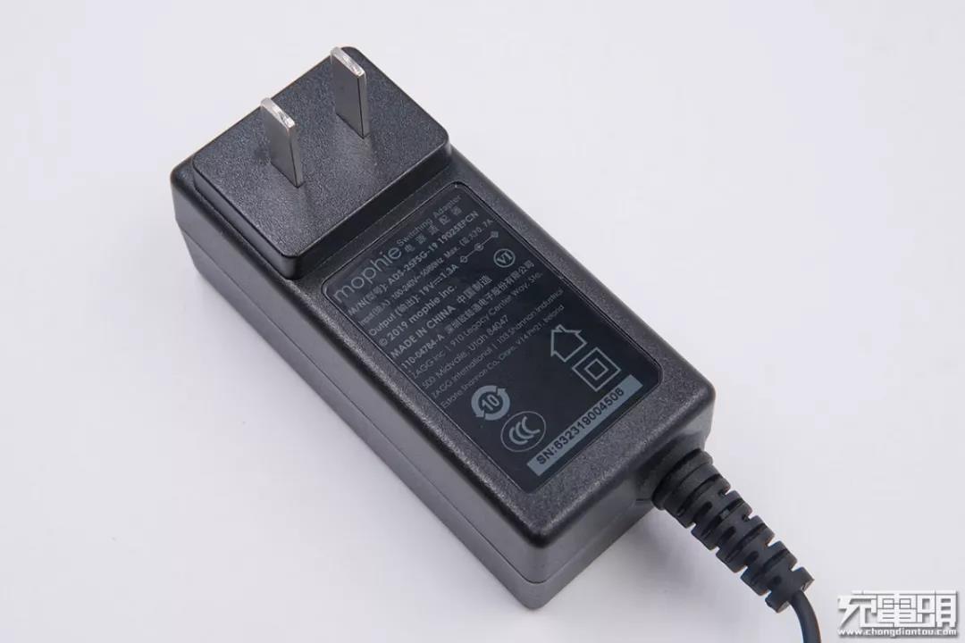 本體線材一體式的設(shè)計(jì),插腳不可折疊。產(chǎn)品名:mophie電源適配器;型號:ADS-25FSG-19;輸入:100-240V,50/60Hz,Max(最大)0.7A;輸出:19V1.3A;制造商:深圳歐陸通電子股份有限公司。