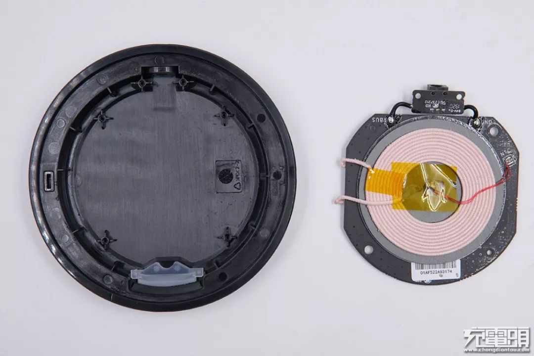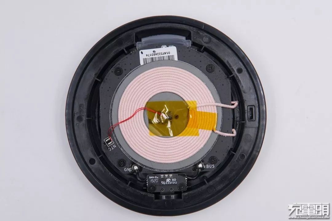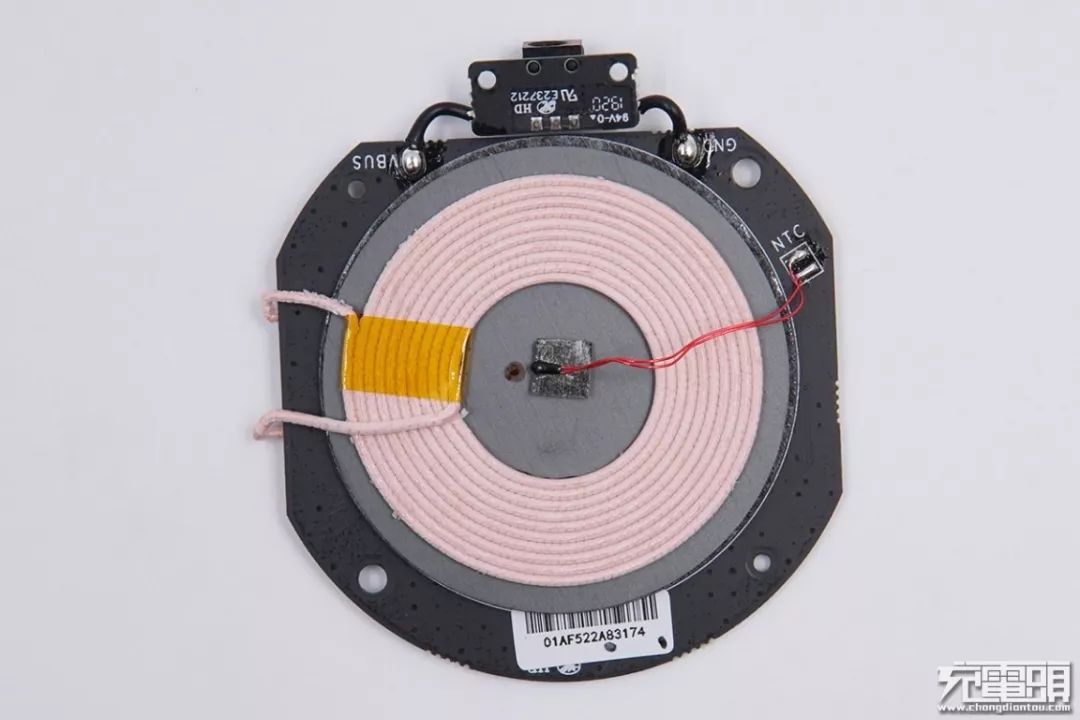 無線充線圈和隔磁片粘附在PCBA板背面,中心位置有一顆熱敏電阻,使用膠布、泡棉雙面膠固定在線圈中央。