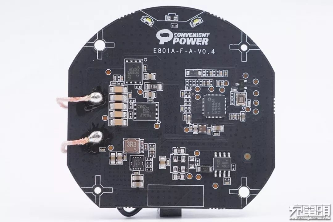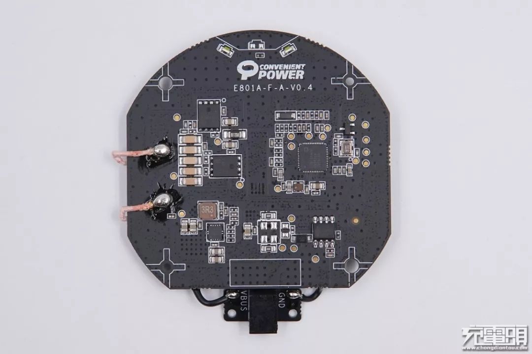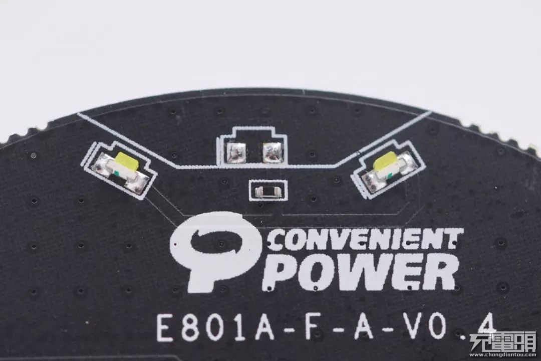 PCBA頂部有兩顆LED指示燈。再往下印刷有Convenient Power易沖半導(dǎo)體的Logo,并標(biāo)有易沖無線充模組名稱代號:E801A。