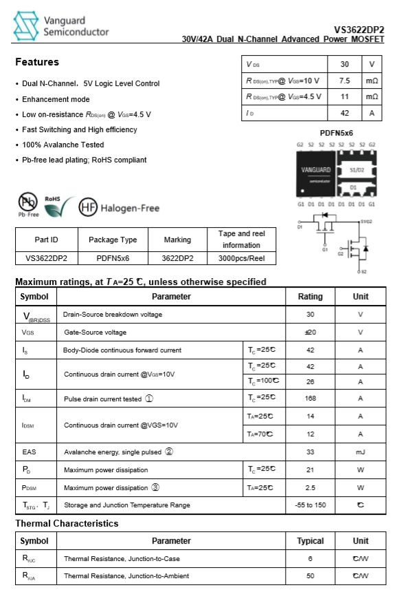 威兆 VS3622DP2 雙NMOS管,用于無線充電線圈驅(qū)動。邏輯電壓驅(qū)動,更好適配無線充電主控。內(nèi)置雙MOS,兩顆即可組成完整全橋。