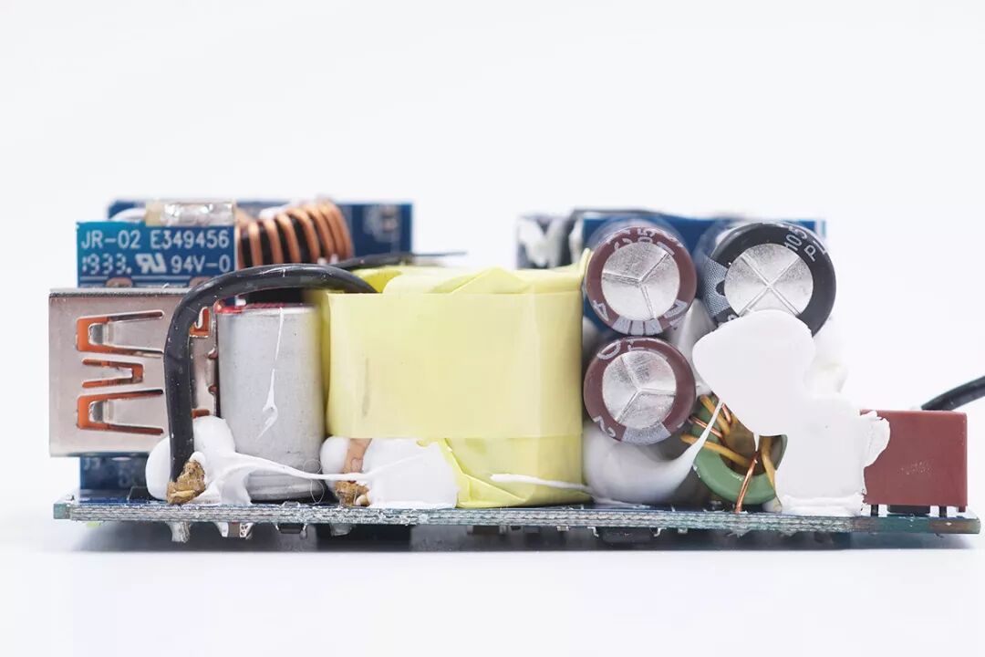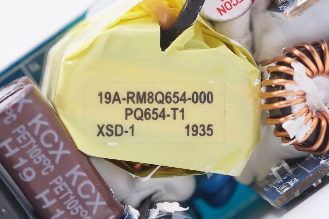 去掉導熱墊之后,PCB板初級側有一顆主控芯片和一顆氮化鎵芯片,次級側有一顆同步整流控制芯片;初次級之間預留了足夠的安全距離,并有鏤空設計;初次級之間設有光耦反饋元件。