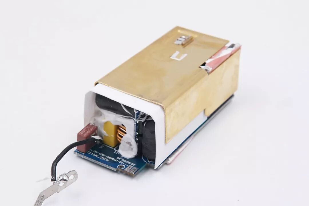 從AC插腳側打開充電器,外殼采用超聲波焊接,AC插腳內(nèi)側一端直接采用彈片與PCB板接觸導通,另一端采用一根硅膠導線連接導通。