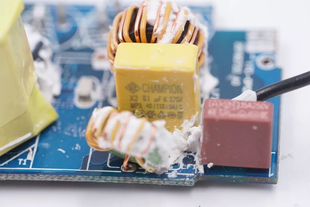 繼續(xù)拆開PCBA模塊外圍的金屬散熱片,內(nèi)部插件元器件布局緊湊,并有硅膠固定。輸入端設有多顆電解電容濾波。