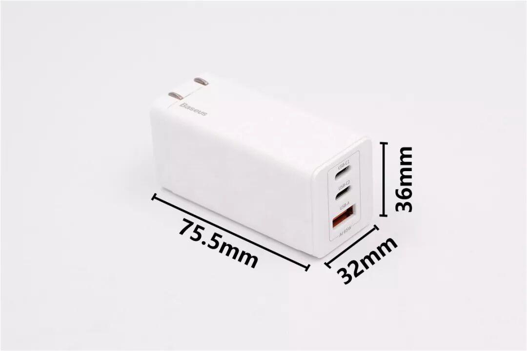 愛否開物1A2C 65W PD氮化鎵充電器三圍大小為:75.5mm*36mm*32mm。