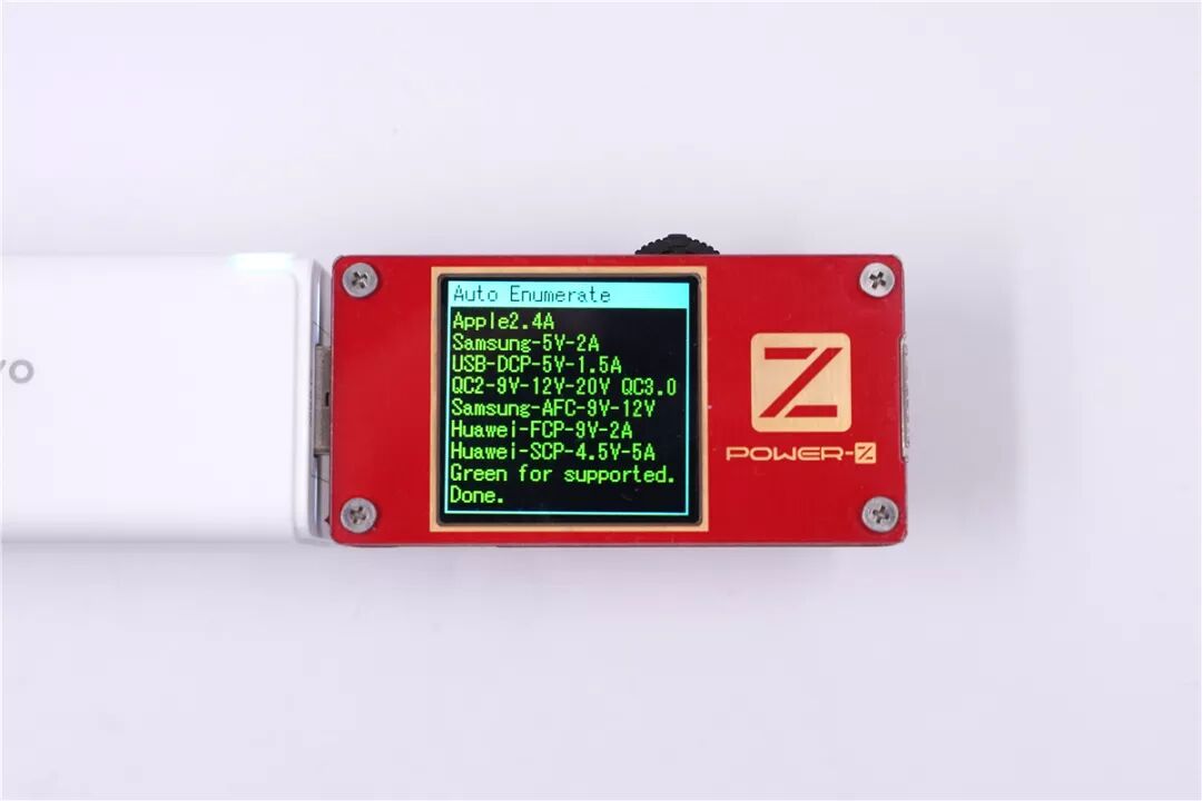 使用ChargerLAB POWER-Z KT001對充電器USB-A口進行協(xié)議檢測,測試表界面全綠,支持Apple 2.4A、DCP協(xié)議,以及QC 2.0、QC 3.0、AFC、FCP、SCP快充協(xié)議。
